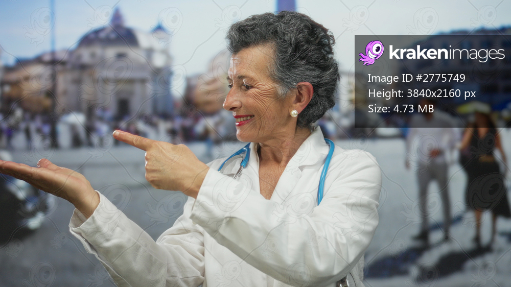Smiling senior woman doctor with grey hair and stethoscope gestures outdoors in urban square at the vatican.