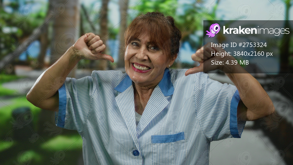 Smiling senior woman in uniform points thumbs at herself in an outdoor park setting, showcasing pride and joy in her occupation.