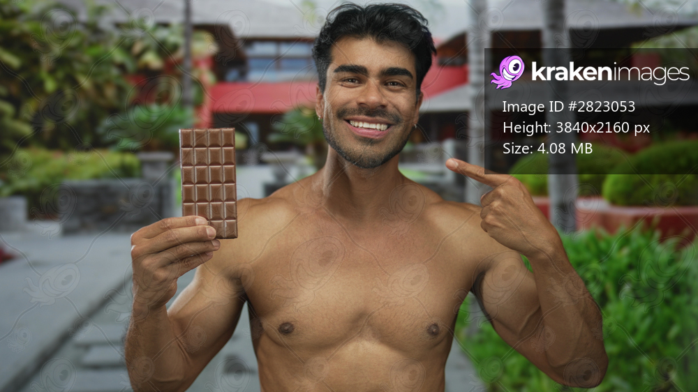 Smiling shirtless young man holds chocolate bar and points finger on street near building facade and greenery; happiness.