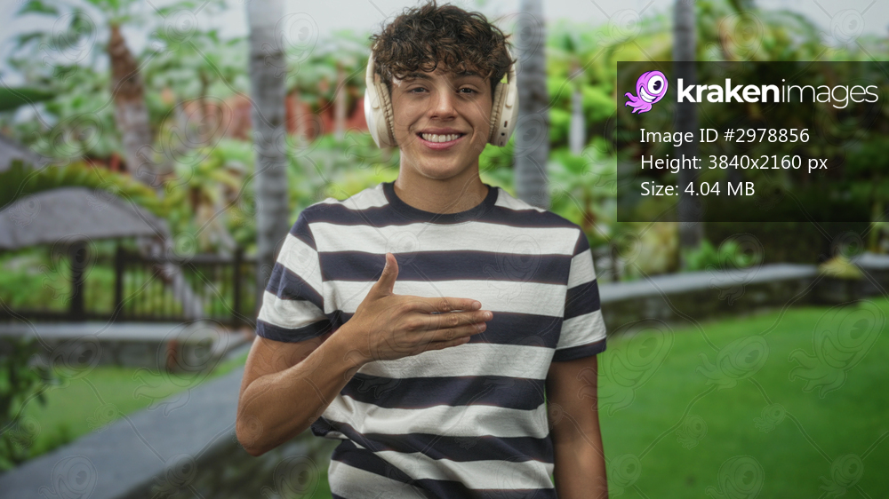 Smiling teenage boy wearing striped t shirt and over ear headphones, hand palm up to chest gesture in forest setting with palm trees and stone wall; playful joy. - Kraken Images