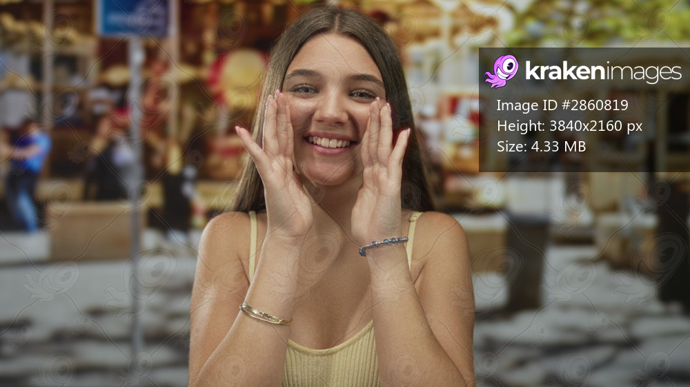 Smiling teenage girl cups hands around mouth at outdoor fair with colorful carousel rides and blurred crowd behind her; joy.