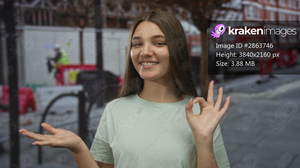 Smiling teenage girl holds open palm and gives thumb up gesture at an urban construction site; optimism.