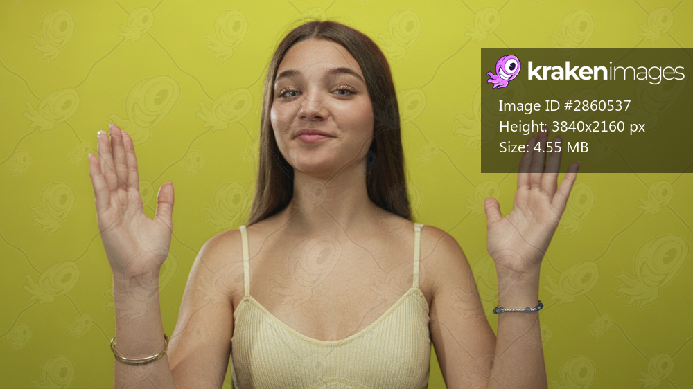 Smiling teenage girl raises hands in open palm gesture revealing bare shoulders against a yellow studio wall; joy.