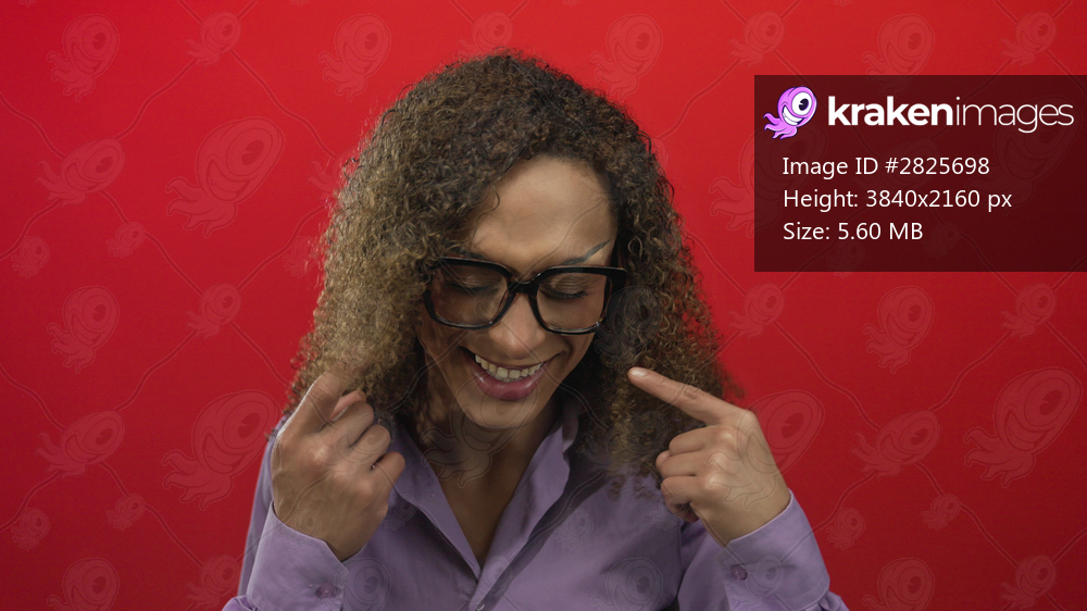 Smiling transgender woman with curly hair and glasses pointing finger to lips with a big smile in red studio; confidence.