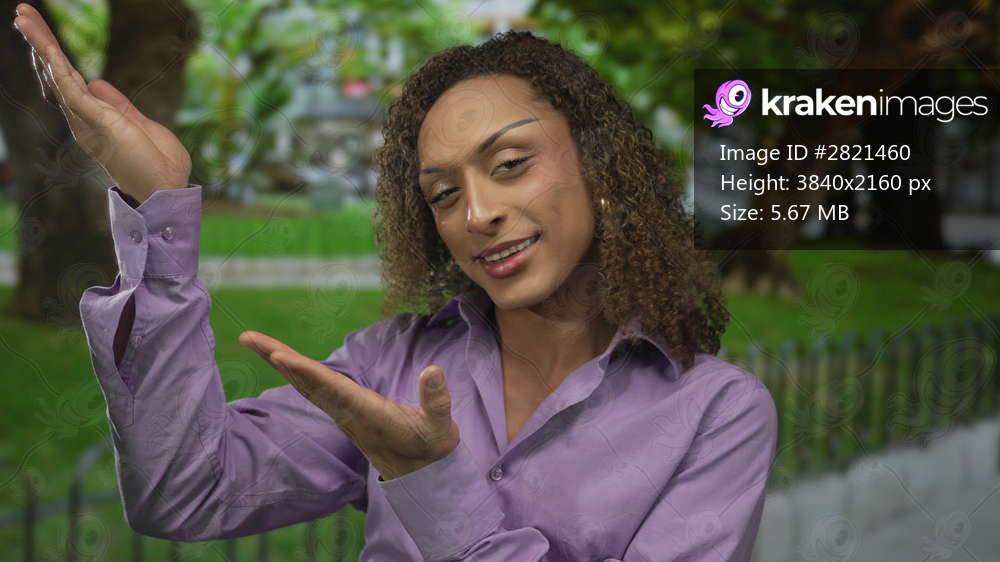Smiling transgender woman in purple shirt with open hands gesture in green forest scene; warm welcome.