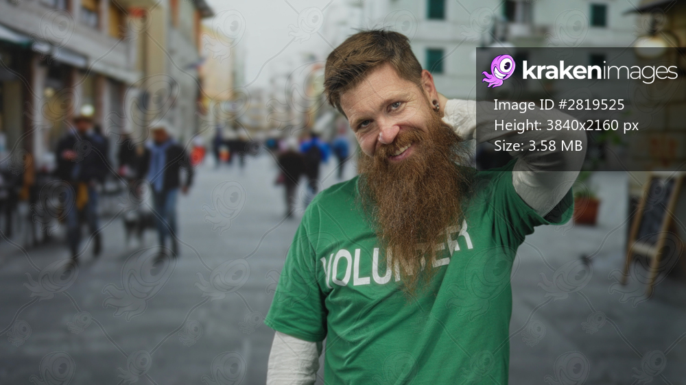 Smiling volunteer man in green shirt uses hand to pull beard on busy sunlit street; compassion service.