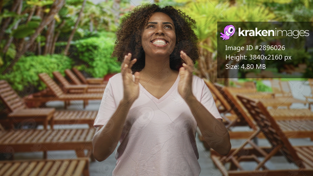 Smiling woman claps hands by wooden poolside lounge chairs in lush forest resort setting; joy celebration.