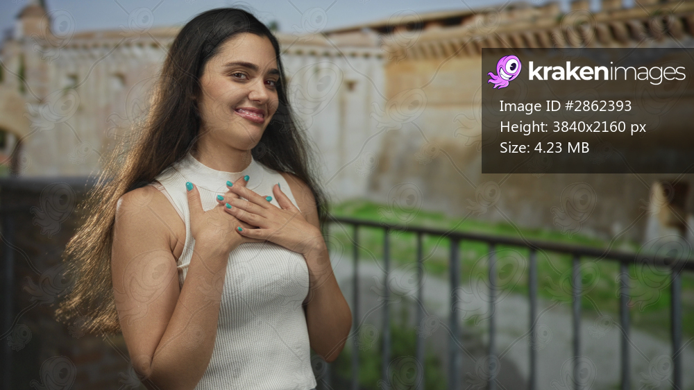 Smiling woman clutches hands to chest on street in old town in front of stone building under sunlight; gratitude.