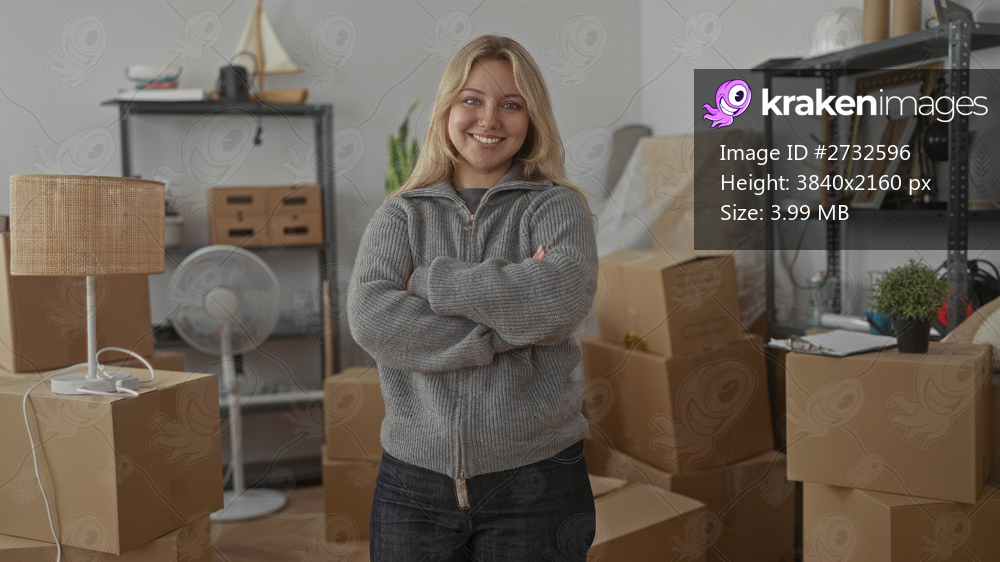 Smiling woman with crossed arms in living room filled with moving boxes and unpacked items suggests new beginnings in home environment.