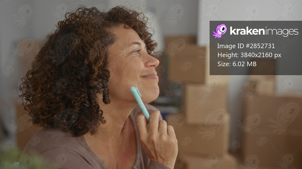 Smiling woman with curly hair holding pen to chin in building surrounded by cardboard boxes; contemplation.