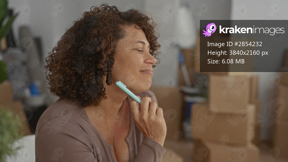 Smiling woman with curly hair holding pen to chin in building surrounded by cardboard boxes; contemplation.