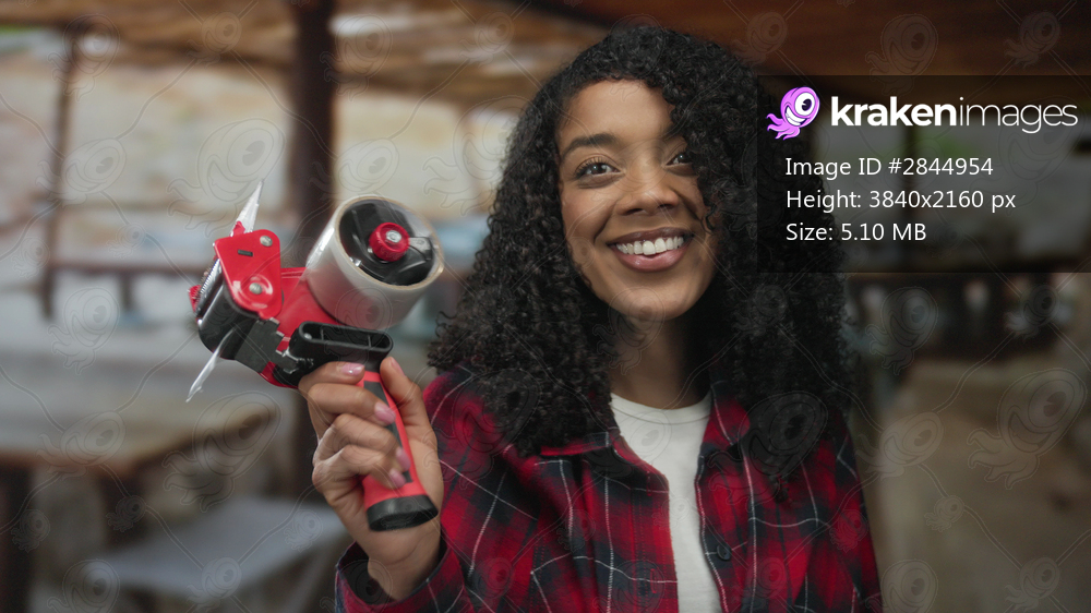 Smiling woman with curly hair holds red tape dispenser by wooden picnic table in building; joy crafting.
