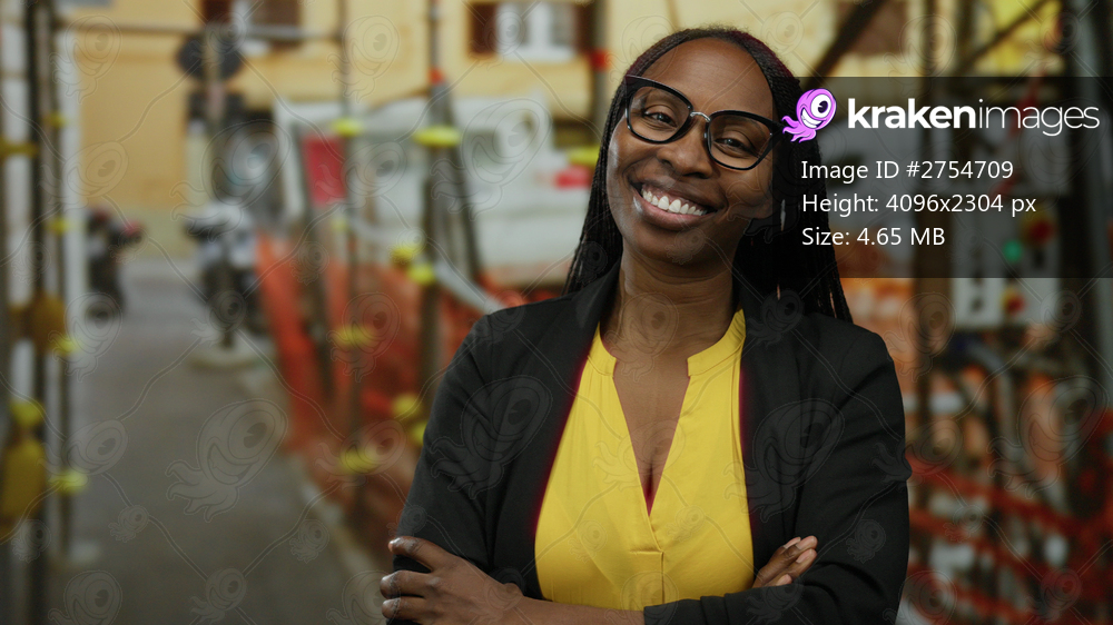 Smiling woman with curly hair in yellow shirt at an outdoor construction site, showcasing happiness and confidence among scaffolding and equipment.
