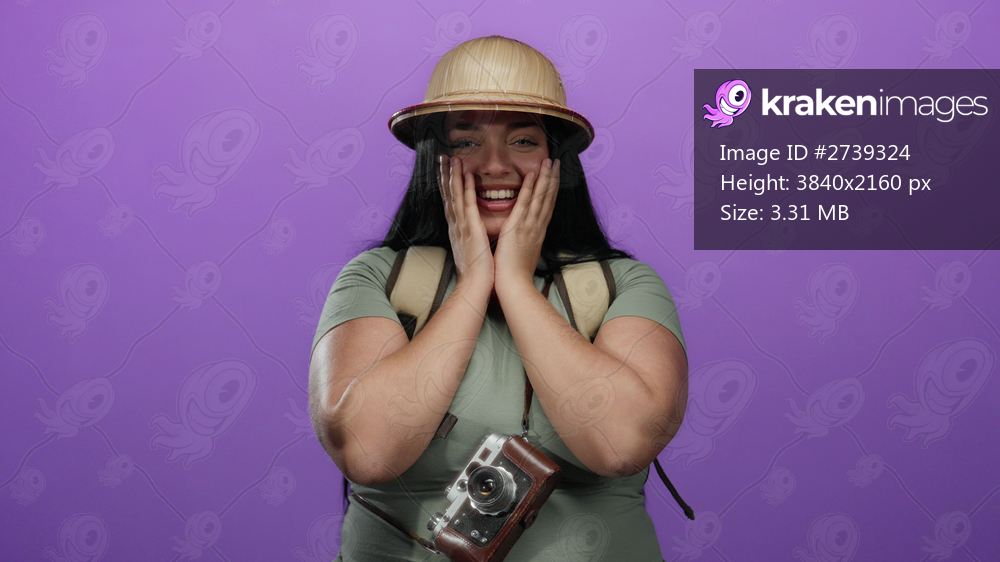 Smiling woman with dark hair wearing explorer hat and holding vintage camera, appearing excited against a vibrant purple background, embodying adventurous travel vibes. - Kraken Images