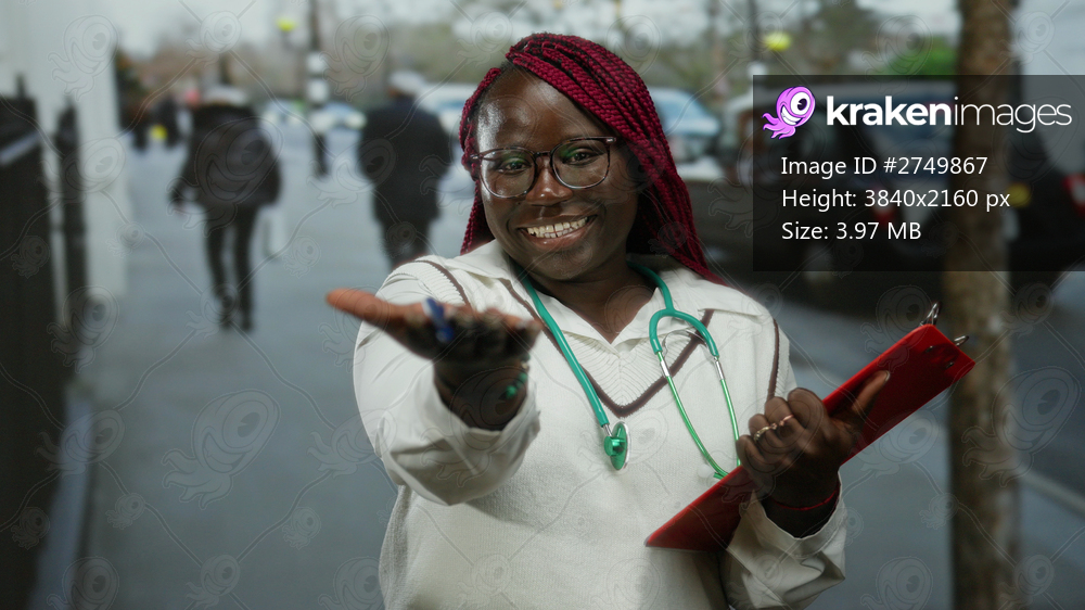 Smiling woman doctor extending hand on city street with clipboard in urban outdoor setting showing friendly gesture to camera during daytime
