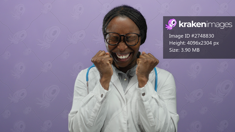 Smiling woman doctor with glasses and stethoscope on purple background radiating happiness and confidence in her profession.