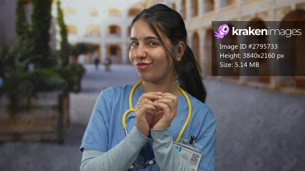 Smiling woman doctor in blue uniform with stethoscope stands in historic old town, showcasing professional confidence and local charm.