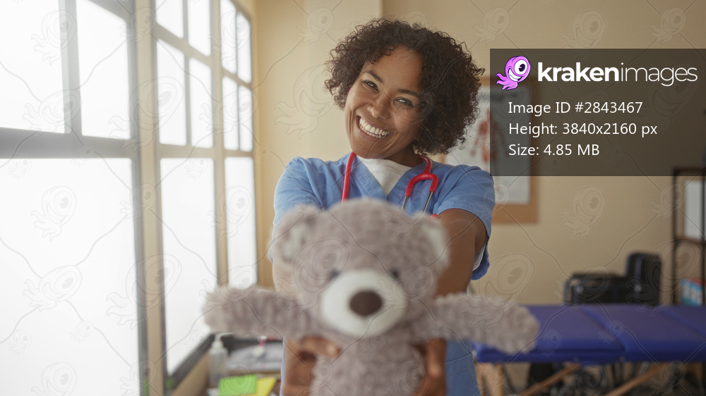 Smiling woman doctor wearing stethoscope holds teddybear with extended arms in building; compassion hope care healing.