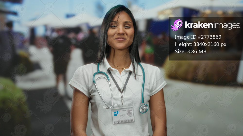 Smiling woman doctor wearing stethoscope standing outdoors in vibrant market street surrounded by blurred activity with a friendly expression and engaging disposition - Kraken Images
