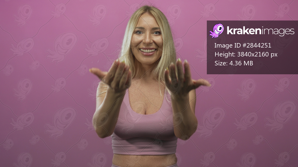 Smiling woman with extended arms presents open palms and bare shoulders in studio with pink background; welcome joy.