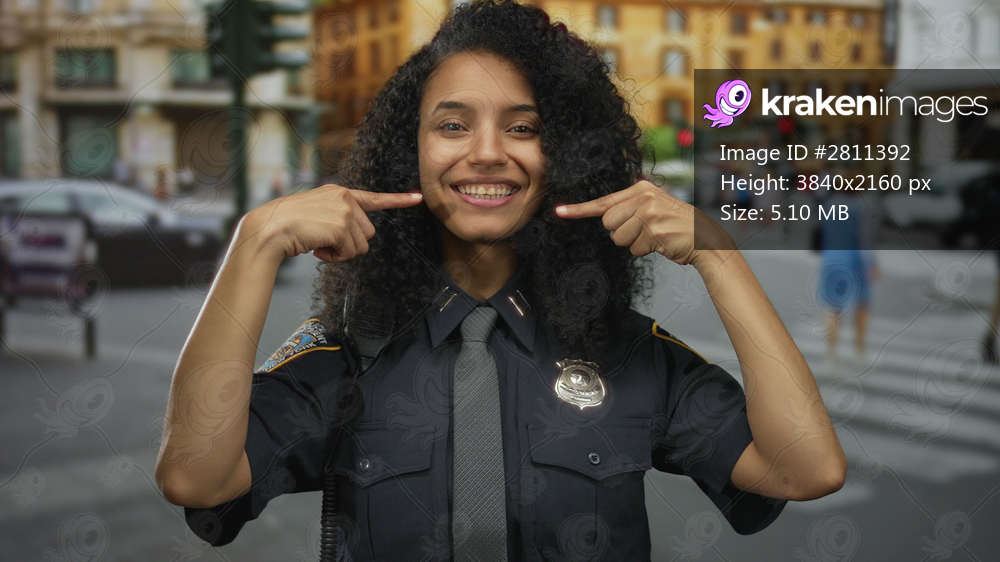 Smiling woman finger pointing to mouth on a busy urban street lined with buildings and cars; confidence.