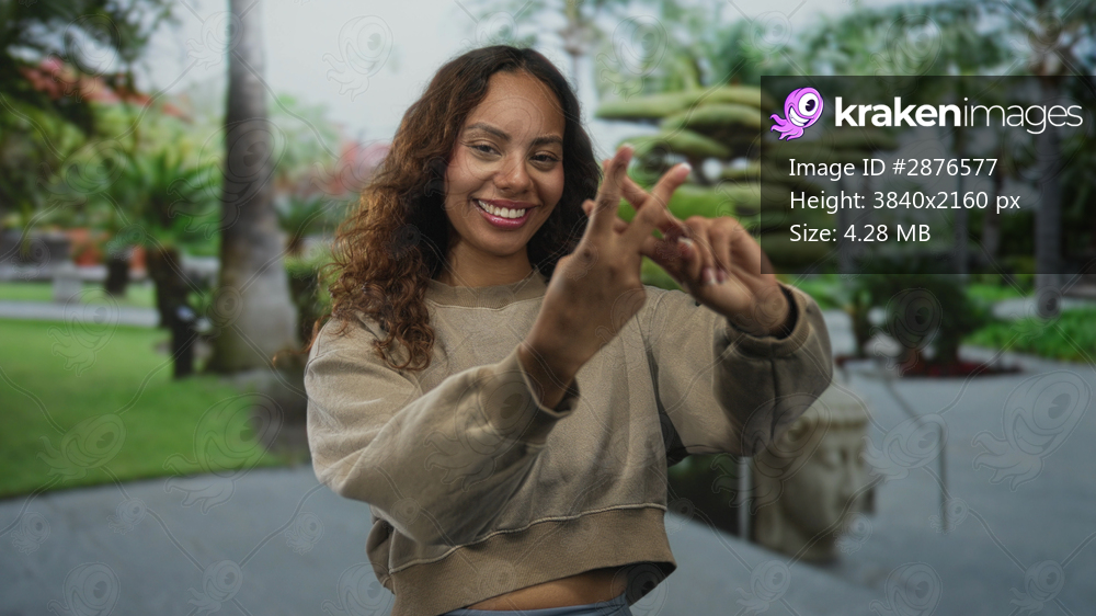 Smiling woman forms hashtag with fingers on tree lined street, bare hands in focus and casual cropped sweater; joy connection.