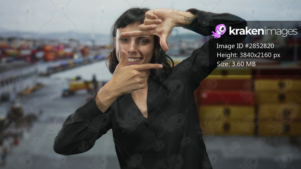 Smiling woman frames port view with fingers in casual black shirt against stacked shipping containers; happiness.