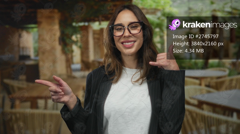 Smiling woman gesturing call me while pointing at restaurant terrace outdoors in city setting.