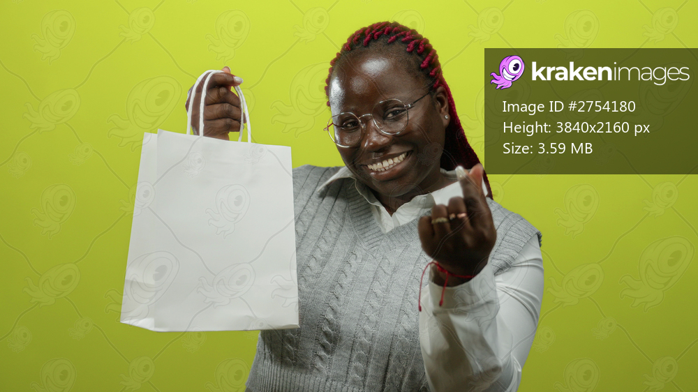 Smiling woman with glasses makes heart gesture holding a shopping bag against a bright yellow background.