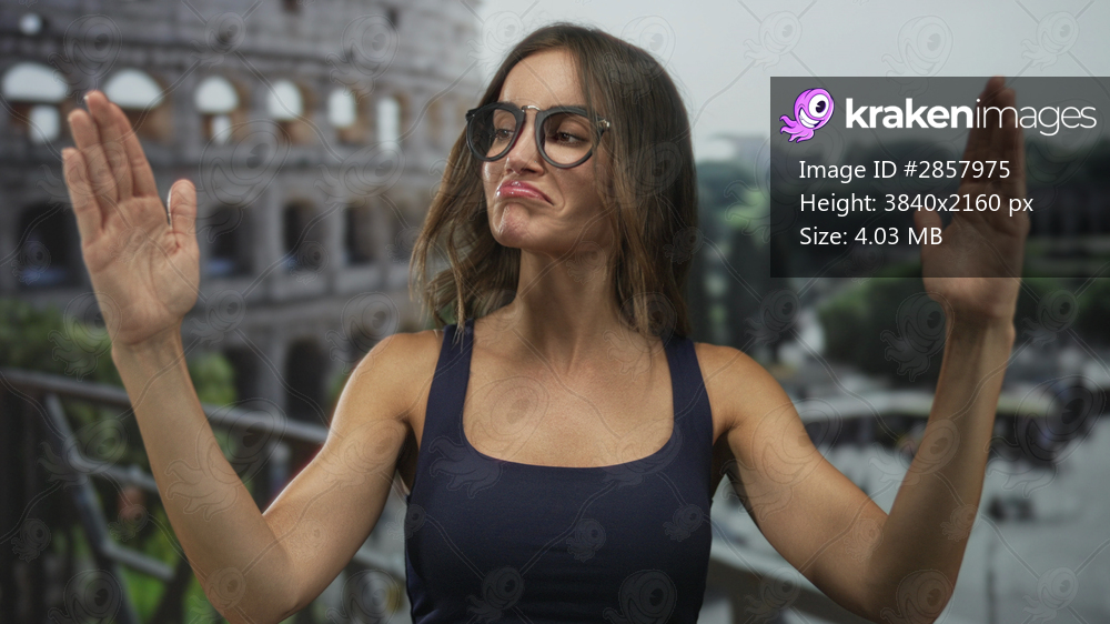 Smiling woman with glasses wearing navy tank top raises hands before coliseum building on sunny terrace; vacation joy.