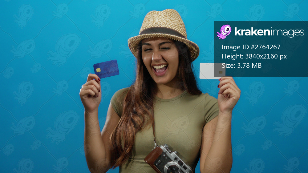 Smiling woman, hispanic, wearing hat, holding credit cards, with camera around neck against blue isolated background showing travel enthusiasm.