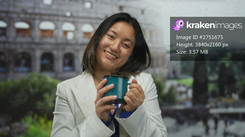 Smiling woman holding a coffee cup in front of the roman coliseum, blending culture and travel in an iconic italian setting.
