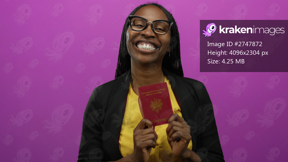 Smiling woman holding a french passport stands confidently against a vibrant pink background, exuding a sense of travel and identity with her yellow shirt and glasses. - Kraken Images