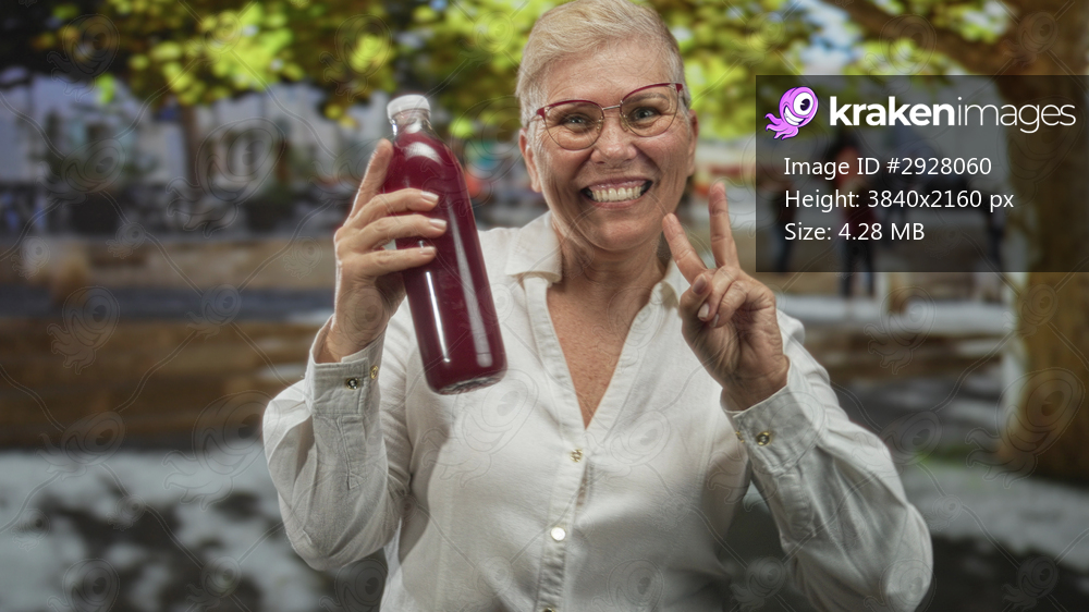 Smiling woman holding a juice bottle and showing peace sign on street with leafy trees and buildings in view; wellness vitality joy.