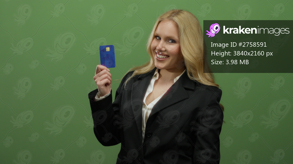 Smiling woman holding blue credit card against green background wearing black suit highlighting finance and success