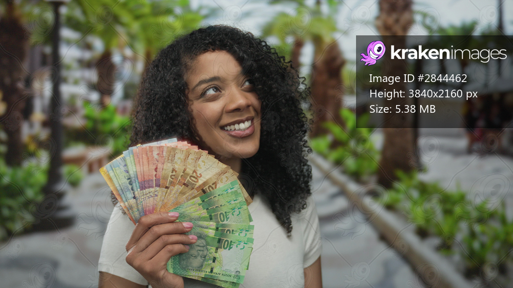 Smiling woman holding colorful rand banknotes on a street walkway lined with palm trees; wealth abundance.