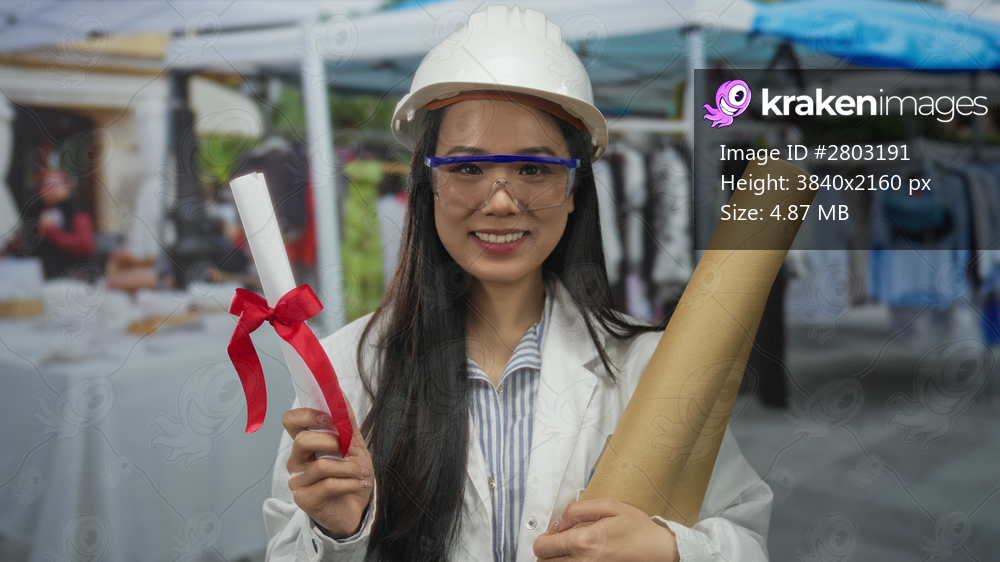 Smiling woman holding diploma and blueprints in city street with shops wearing hardhat reflecting architectural success.