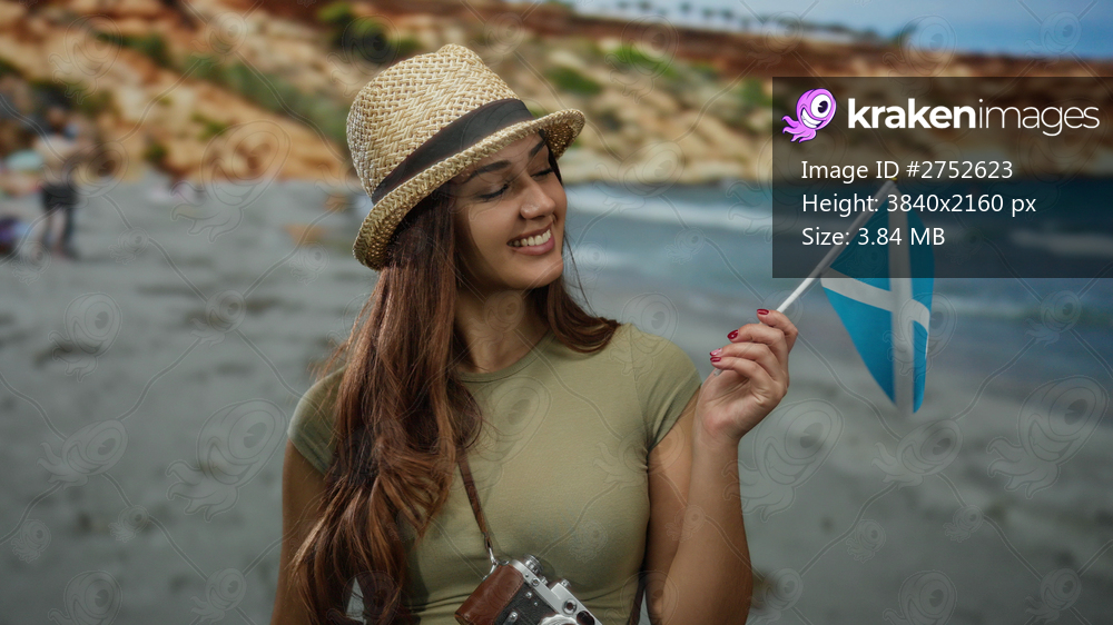Smiling woman holding scottish flag on seaside beach, wearing a hat while enjoying the outdoor scenery, capturing the essence of travel and tourism.