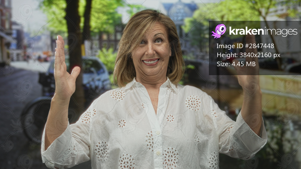 Smiling woman holds arms open on a sunny city street with canal and parked cars behind her; happiness.