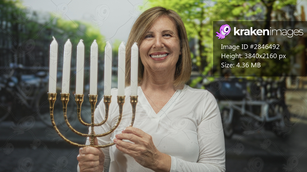 Smiling woman holds brass menorah with unlit candles on street in daylight amid green trees; holiday tradition joy.