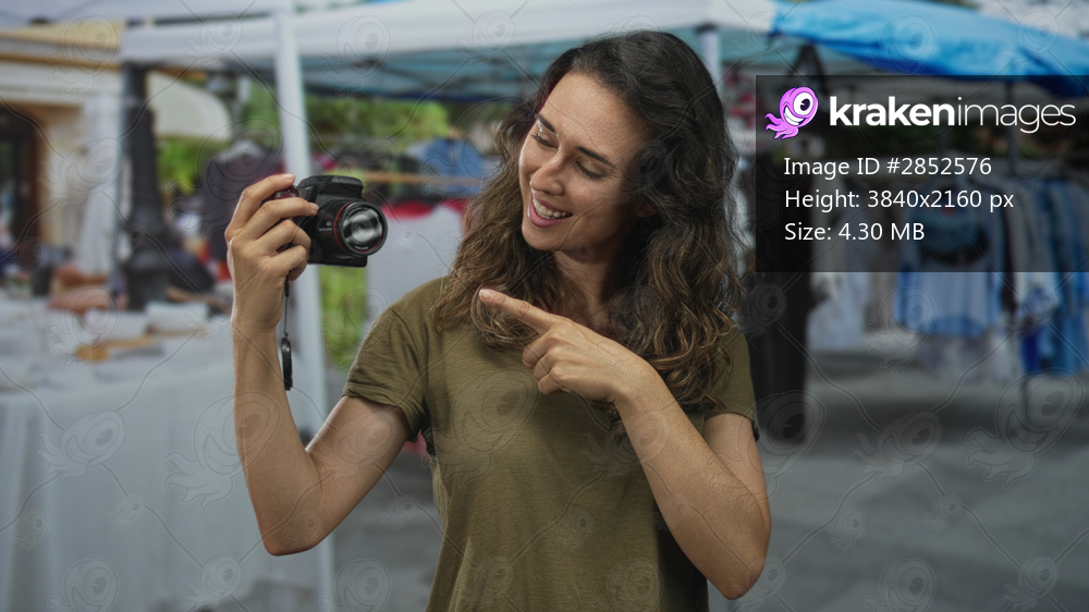 Smiling woman holds camera and points finger to camera amid outdoor street market stalls; curiosity.