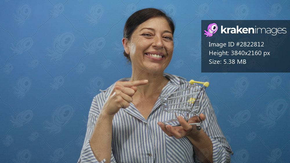Smiling woman holds miniature shopping cart with yellow handle and points finger in blue studio; shopping joy.