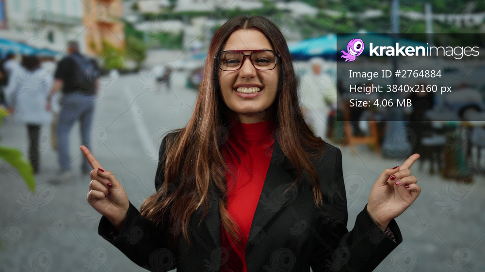 Smiling woman in glasses and black jacket pointing both ways outdoors on a bustling city street with people in the background and blue umbrellas visible in the distance. - Kraken Images