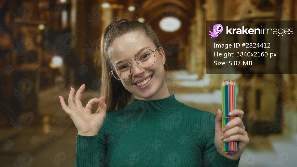 Smiling woman in green sweater holds colored pencils while making thumbs up gesture inside a building; creativity.