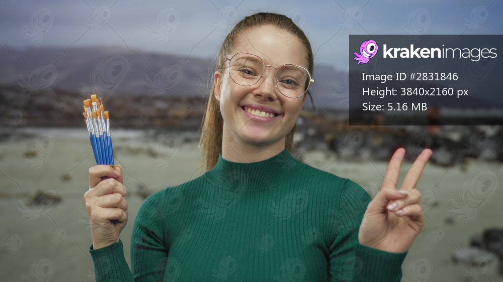 Smiling woman in green sweater holds paintbrush and points finger at seaside shore; creative inspiration.