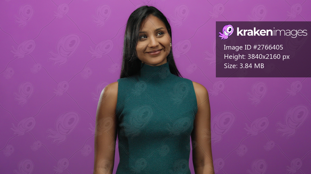 Smiling woman in green top stands against vibrant pink background, embracing happiness and simplicity for a cheerful and modern portrait.