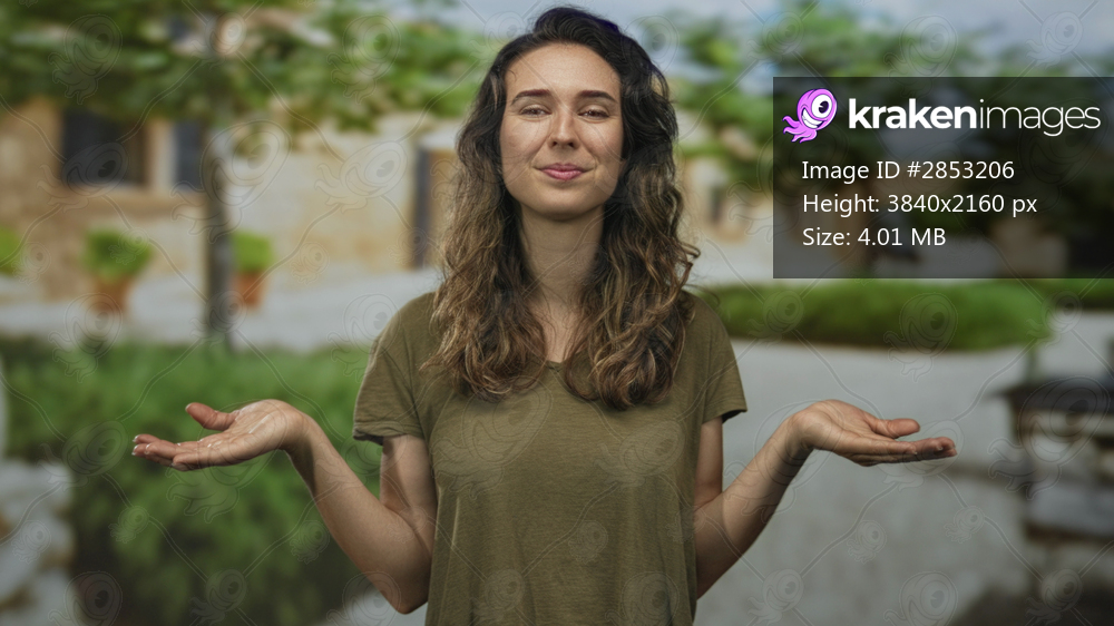 Smiling woman in olive shirt holds palms up in green park under soft warm bright sunlight; serenity.
