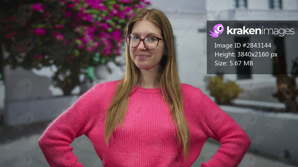 Smiling woman in pink sweater stands with hands on hips on street under blooming bougainvillea; confidence.