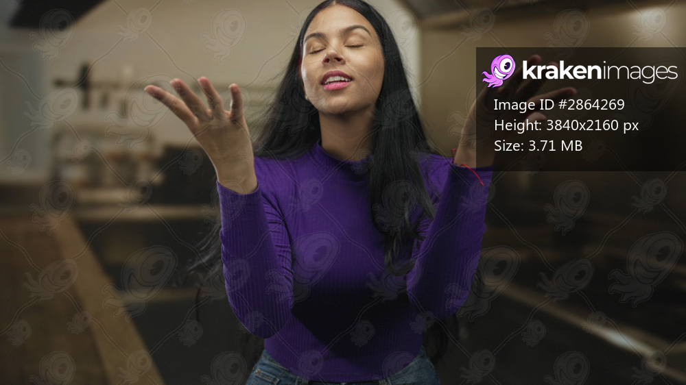 Smiling woman in purple sweater brings pinched fingers to lips for silence in a domestic kitchen; contentment.