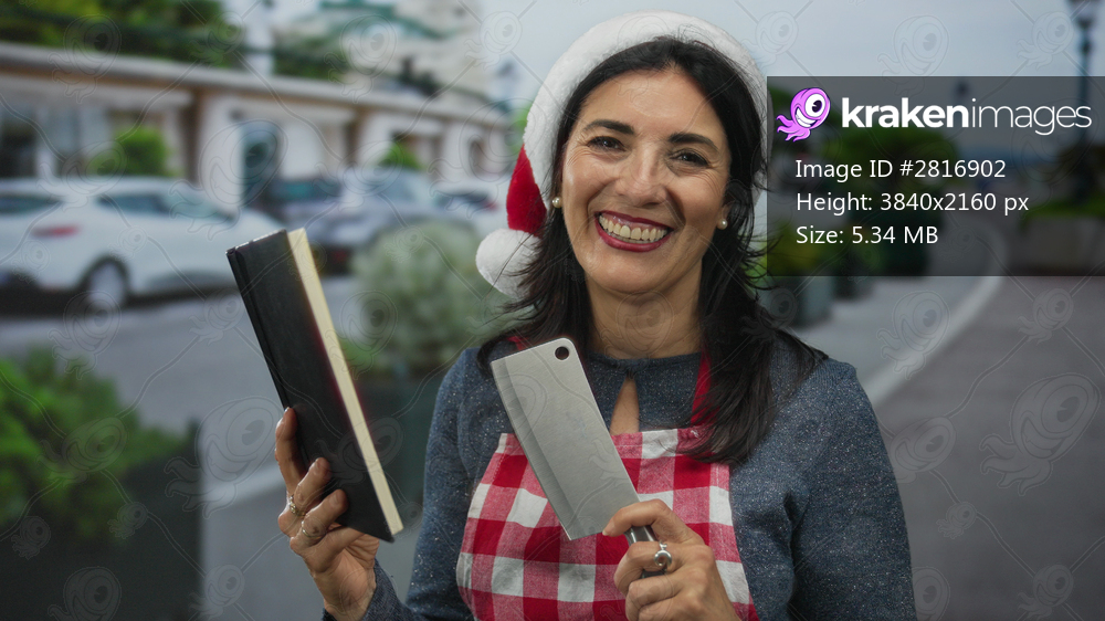 Smiling woman in red check apron and santa hat holds cleaver and book on city street; holiday cheer.